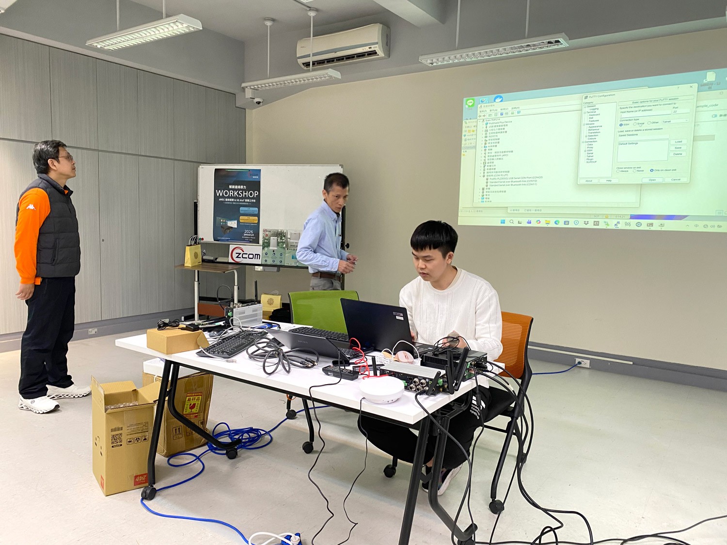 This workshop broke away from traditional one-way teaching by adopting a teacher-student team-based model, emphasizing collaborative learning and practical cooperation. The training focused on Z-COM’s self-developed zMEC (Edge Computing Platform). Instructors explored contemporary network deployment and management architectures in depth and demonstrated how to use 5G Gateways as a core hub to efficiently collect data from various AIoT sensors. In the afternoon session, participants tackled Docker containerization practices, packaging and deploying creative applications onto the zMEC platform.
